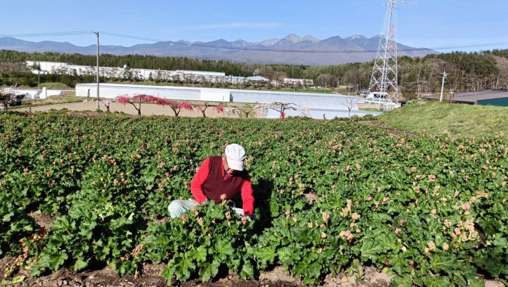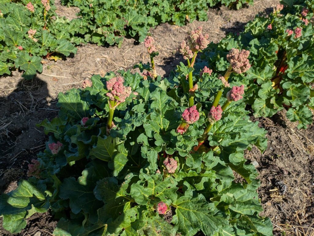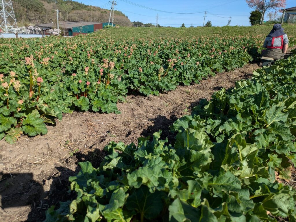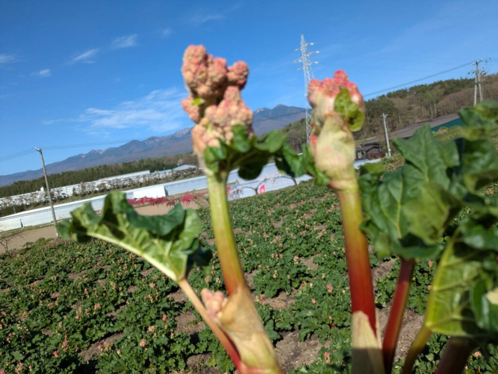 赤いルバーブ 今は花摘みの最盛期です。サクラの開花と同様にルバーブも一週間程早く花芽を付けました。一株に20本前後咲きます。このまま放置しておくと、栄養が全て種に蓄えられる為、収穫する新芽が出ないので花摘みをします。株の良し悪しは秋口にあげた肥料が一番に影響します。ルバーブ栽培は収穫作業もたいへんですが、この花摘みもたいへん、しかも重要な作業です。これを何度か繰り返します。収穫は5月下旬以降を予定しております。年々ルバーブ人気が高まっており、今年は2月からオーダーが来ております。